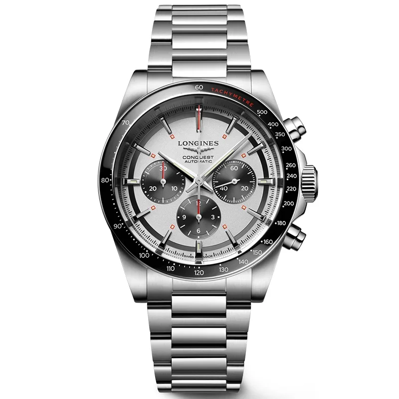 The polished stainless steel case of this Longines Master Collection watch measures to a neat 44 millimetres in size and is fastened effortlessly to the wrist by a comfortable three-row bracelet with two-toned brushed and polished finishing and a triple security folding clasp. The L688 automatic winding movement delivers exceptional functionality, providing the men’s dress watch with blue painted hands for hours, minutes and chronograph seconds, two chronograph subsidiary dials for 12 hours and 30 minutes and a third dial for the small seconds. An angled date window can also be spotted between the Arabic numerals for 4 and 5 o’clock. The unique silver barleycorn dial is the perfect backdrop to these functions, decorated in black numerals, a black minutes track and the legendary Longines winged hourglass logo.
